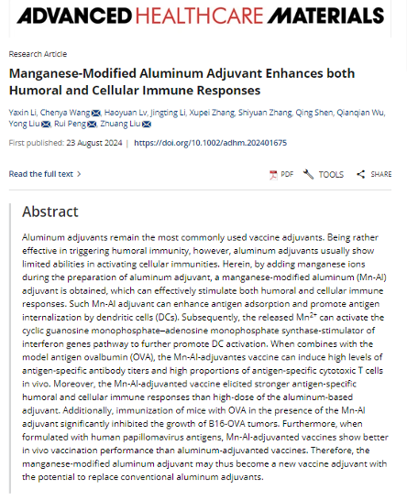 该新型佐剂利用了cGAS-STING通路在抗病毒等免疫反应中的优势,在传统铝佐剂的制备过程中引入锰,通过锰激活cGAS-STING通路以增强机体的免疫反应。实验结果表明Mn-Al佐剂可以增强抗原吸附并促进树突状细胞的抗原内化,且其释放的Mn2+可激活cGAS-STING通路。当Mn-Al佐剂与肿瘤抗原结合后,可以在体内诱导高水平的抗原特异性抗体滴度和高比例的抗原特异性细胞毒性T细胞,抑制肿瘤生长。而当Mn-Al佐剂与人乳头瘤病毒抗原混合后,与传统铝佐剂相比能够诱导机体产生更高的特异性中和抗体水平。综上,Mn-Al佐剂有潜力成为一种新型疫苗佐剂。
